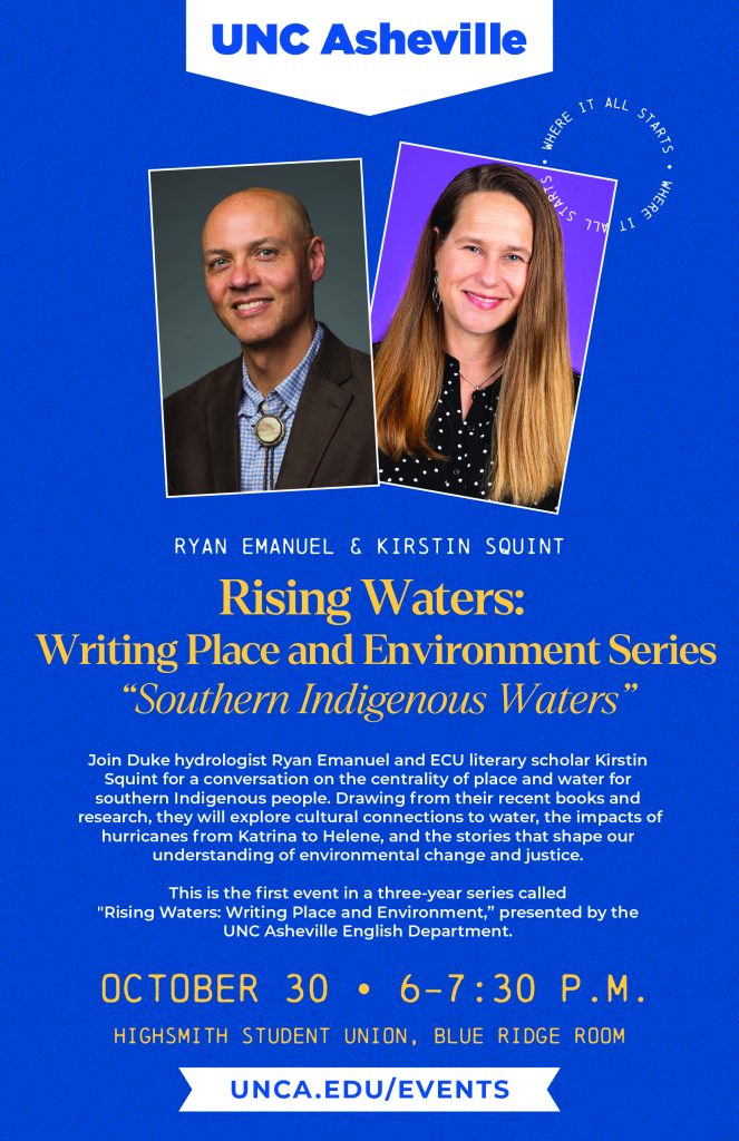“Southern Indigenous Waters” is the first event in UNC Asheville’s Rising Waters: Writing Place and Environment lecture series. Funded by the Thomas Howerton professorship, this three-year program (2025-2028) seeks to: